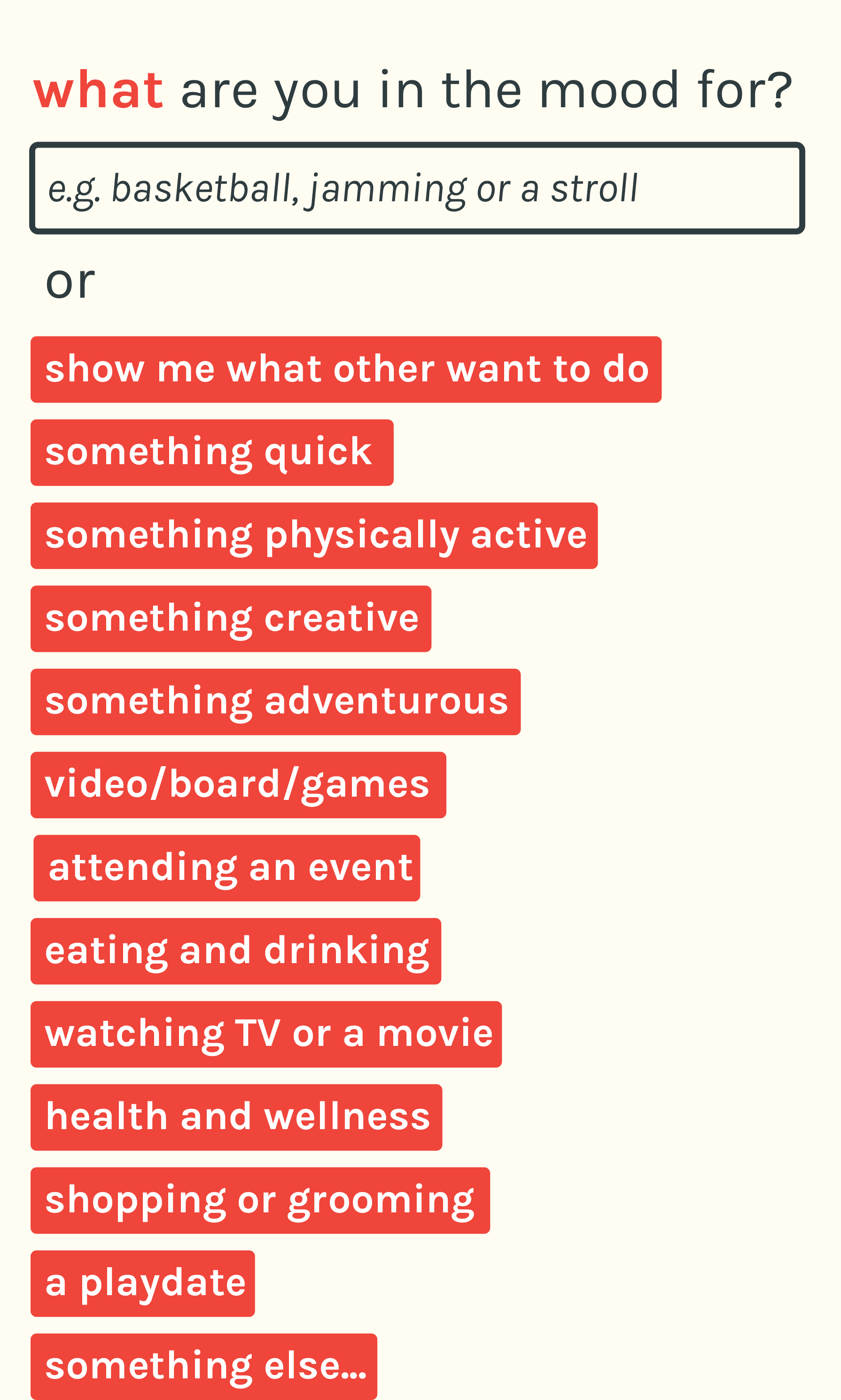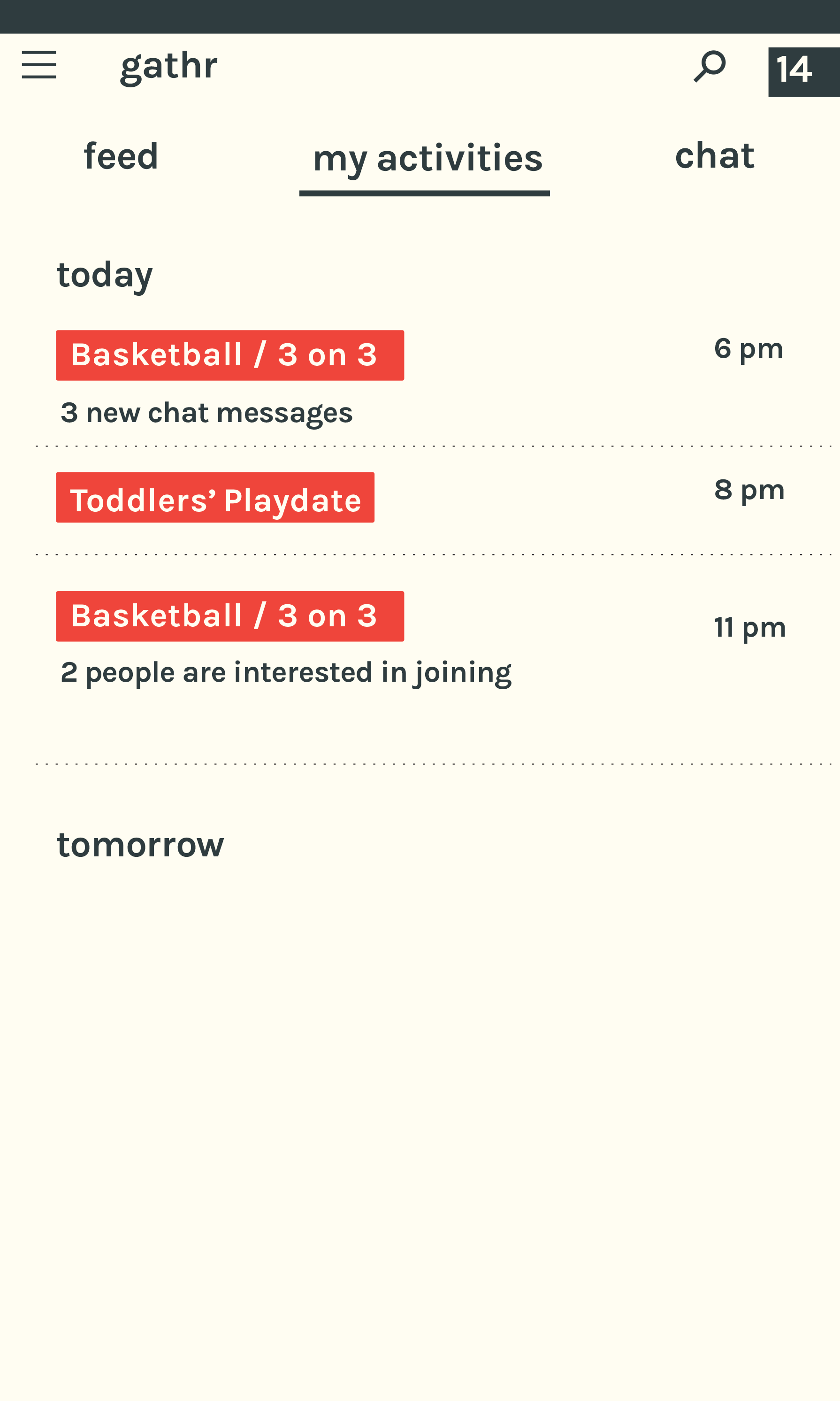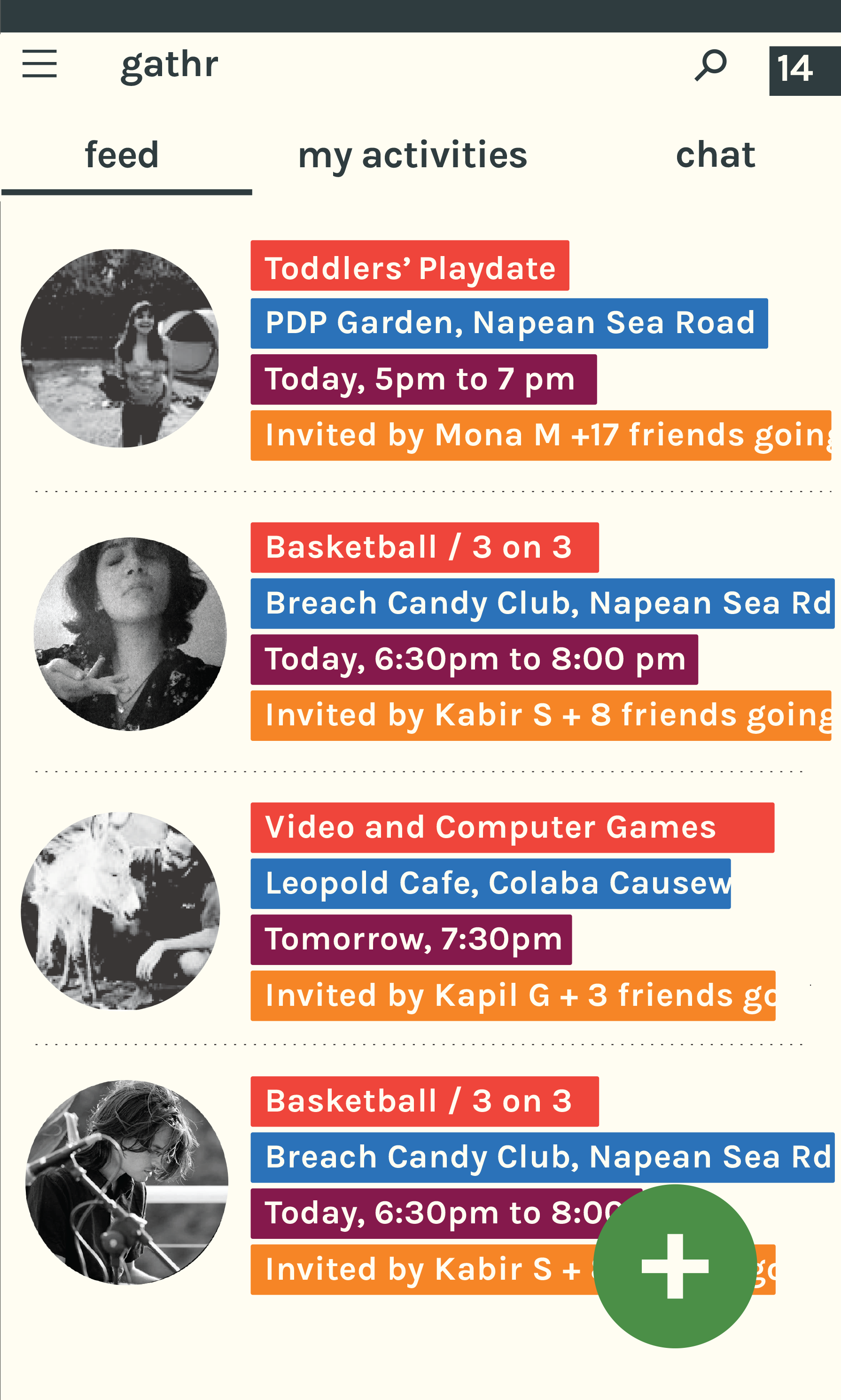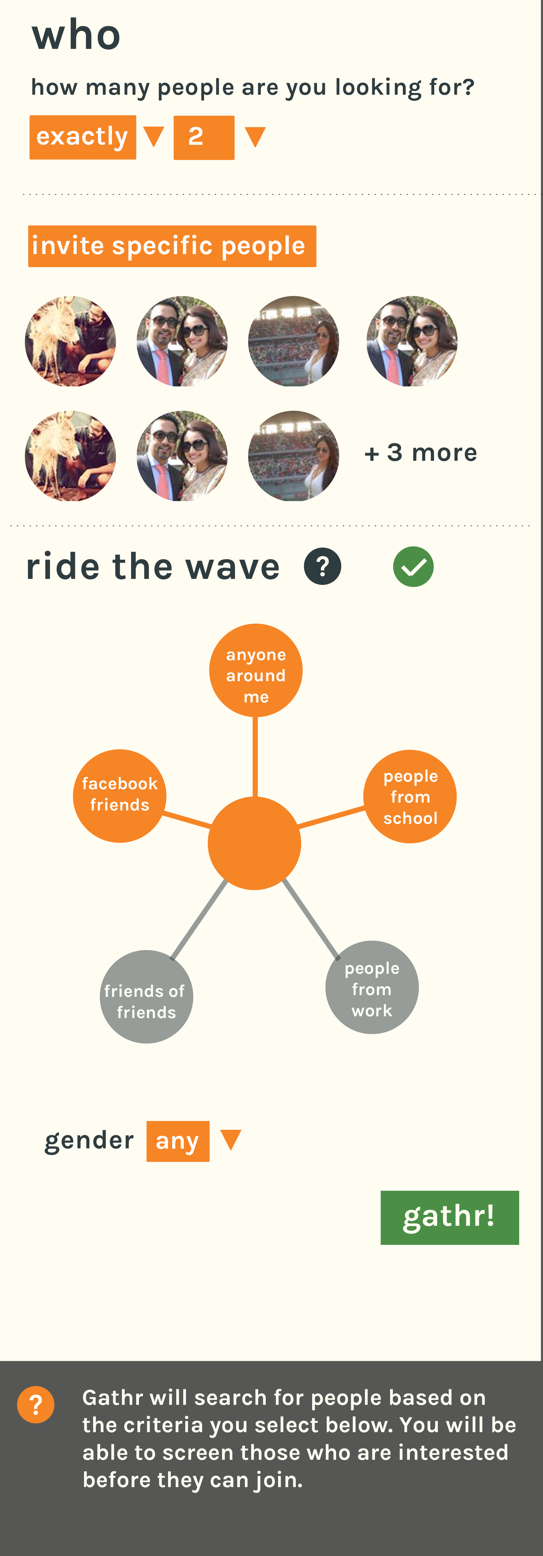 Gathr is a mobile and web application that taps into your extended social and place-based networks to find people who want to do what you want to do when you want to do it by matching momentary impulses and general interests. Gathr is like a Meetup for casual, short-notice, social activities. You can tap into your network of friends of friends to watch a movie tomorrow, tap into your neighbourhood network to set up a playdate for your kids over the weekend, or tap into your network of colleagues to see who wants to play a game of foosball in the afternoon.