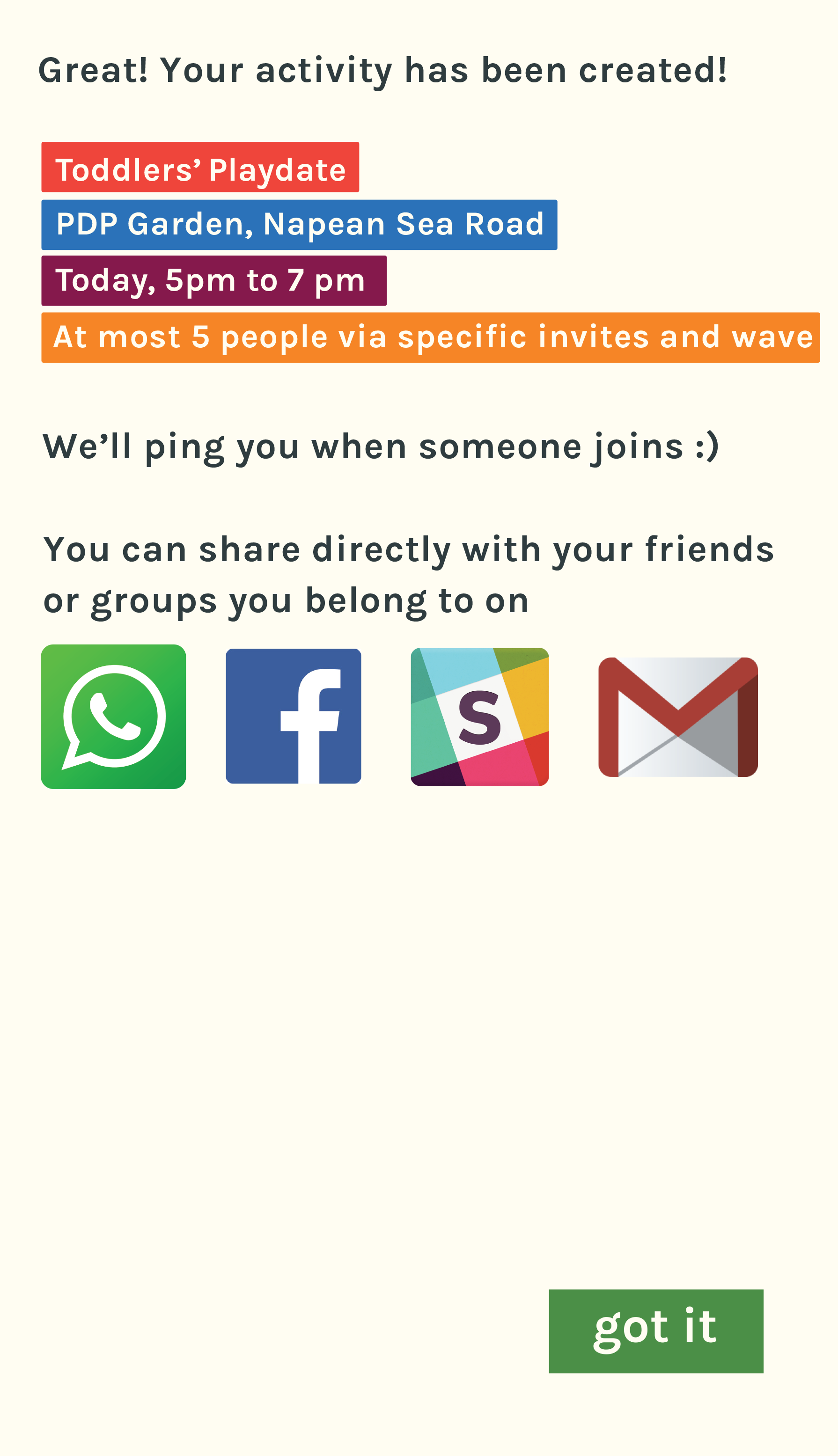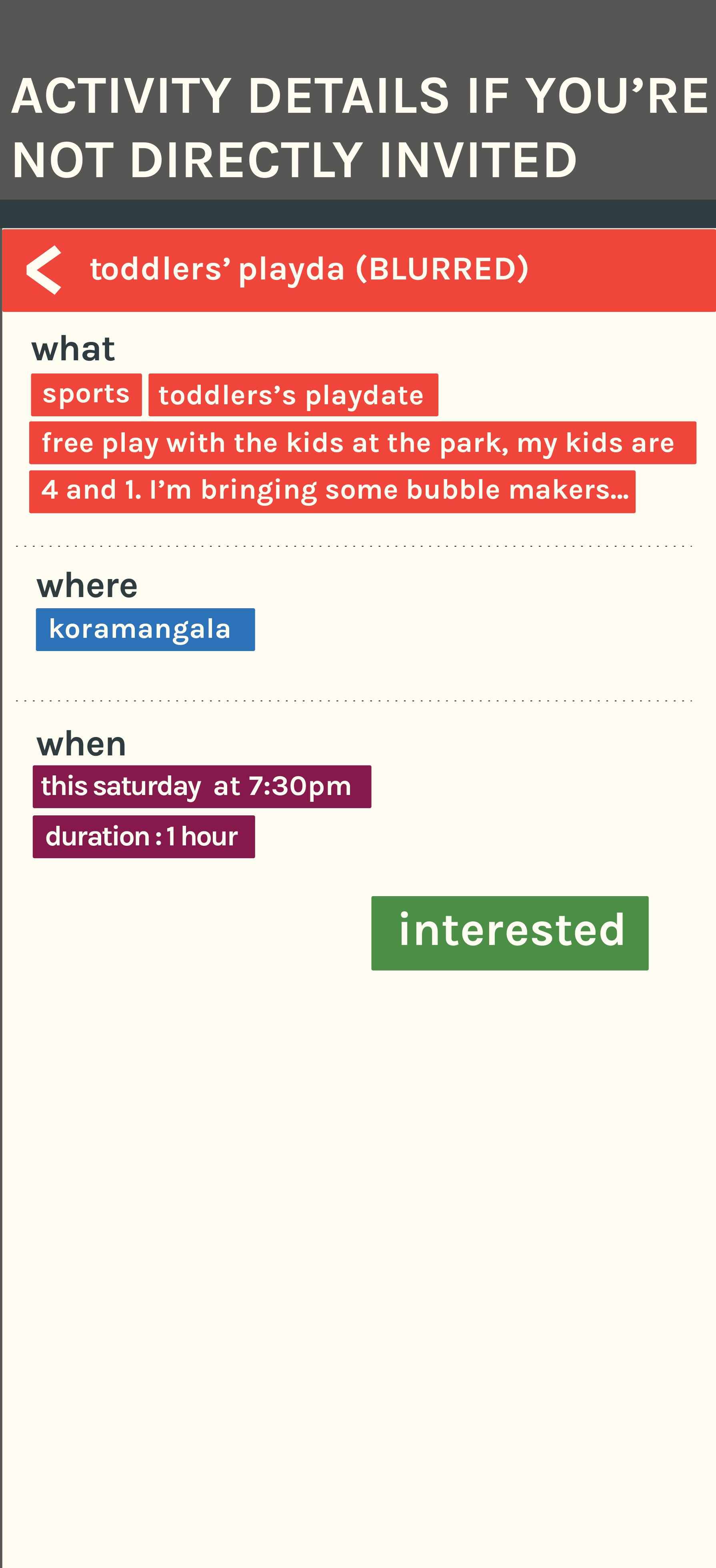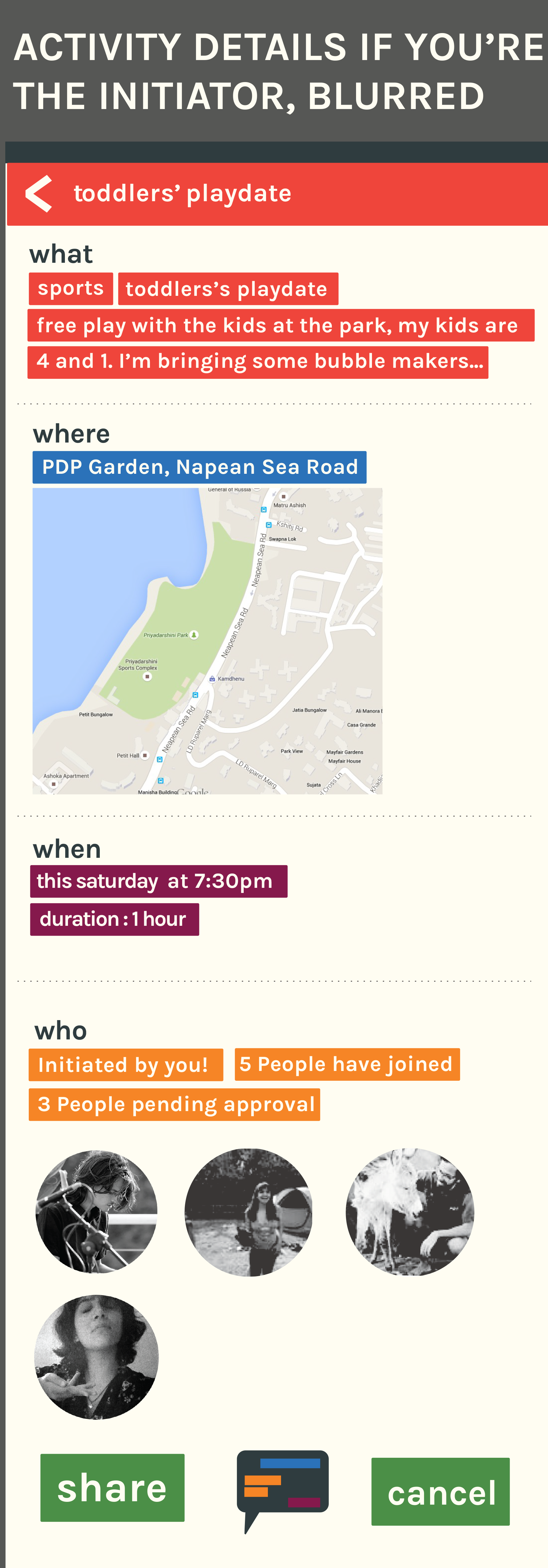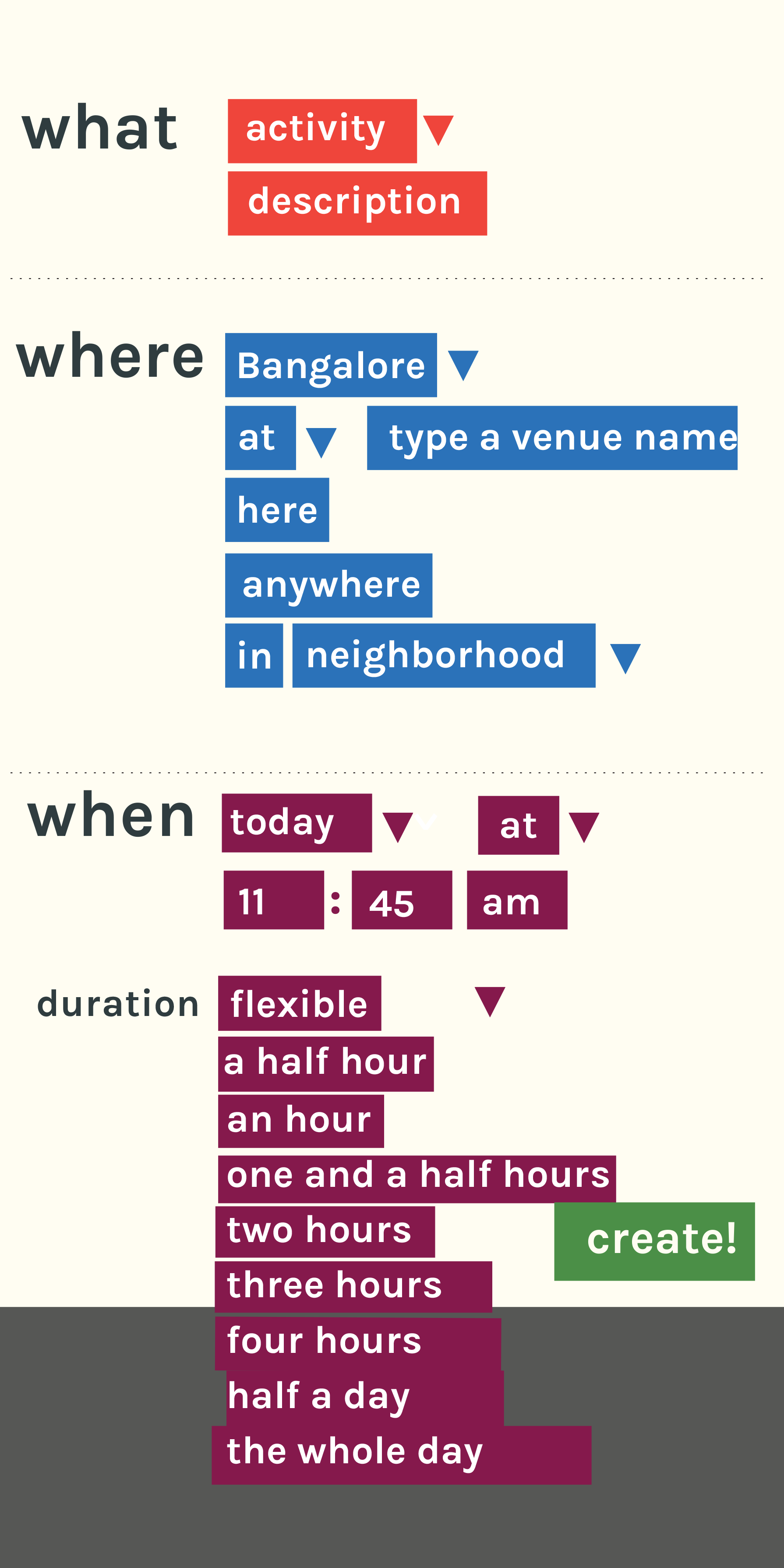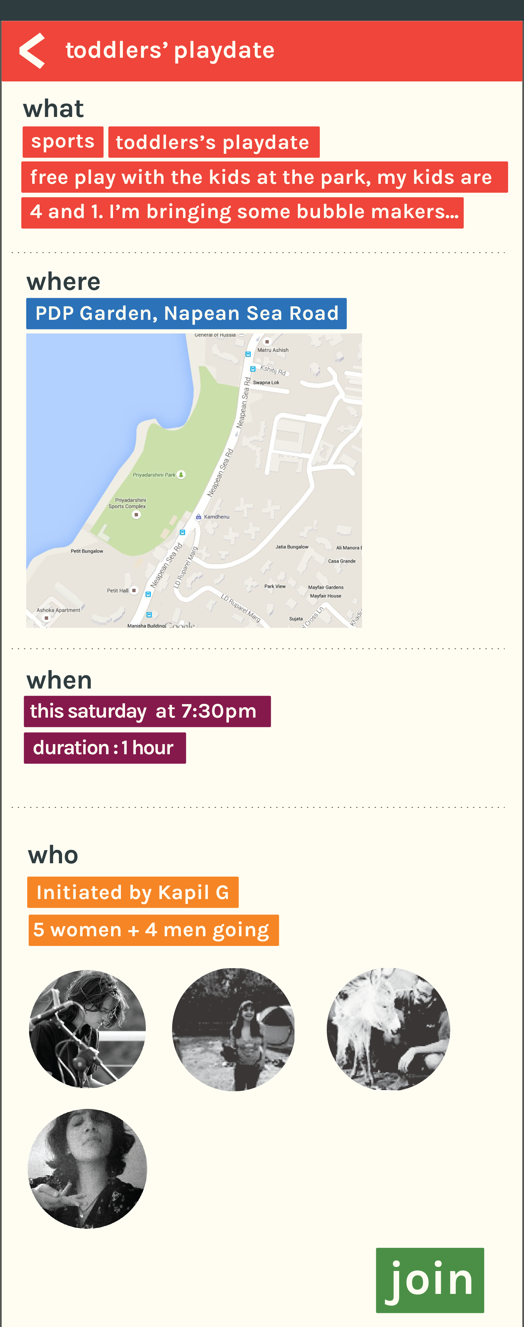 Gathr is a mobile and web application that taps into your extended social and place-based networks to find people who want to do what you want to do when you want to do it by matching momentary impulses and general interests. Gathr is like a Meetup for casual, short-notice, social activities. You can tap into your network of friends of friends to watch a movie tomorrow, tap into your neighbourhood network to set up a playdate for your kids over the weekend, or tap into your network of colleagues to see who wants to play a game of foosball in the afternoon.